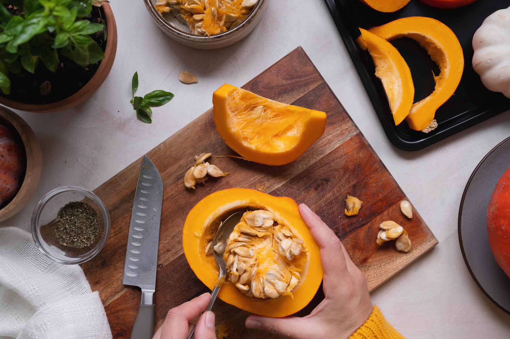 Para empezar con esta deliciosa receta de buñuelos de calabaza, ten a mano todos los ingredientes. Primero hay que empezar pelando la calabaza, quitando las semillas, la troceas y la pones en una cazuela hervir.