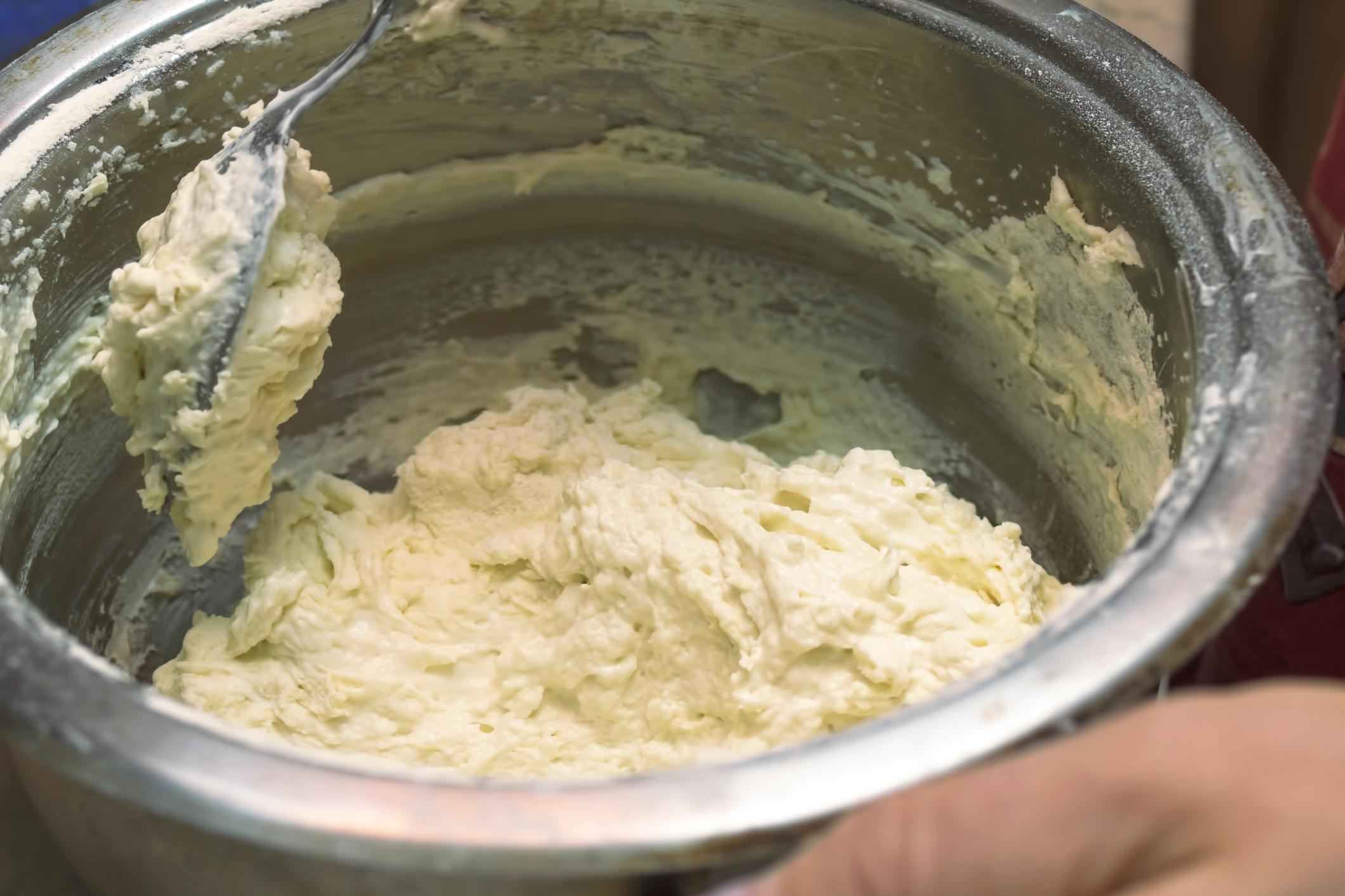 Ahora es momento de poner en el bol la harina bien colada en forma de montaña, e incorporamos la levadura química, el azúcar, la sal, la ralladura y las yemas de huevo. Hay que trabajar bien toda esta mezcla para que quede muy homogénea, y poco a poco ir añadiendo un poco de agua que hemos usado para hervir la calabaza, como mucho unas 15 cucharadas.