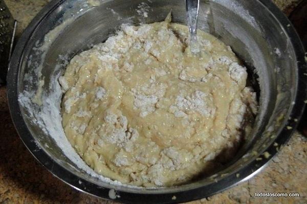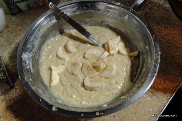 Una vez tengas todo el plátano cortado a rodajas, añádelo al recipiente y remueve junto a la mezcla anterior. Como verás la masa no debe ser muy consistente, debe notarse cierta liviandad y una consistencia mas bien líquida.