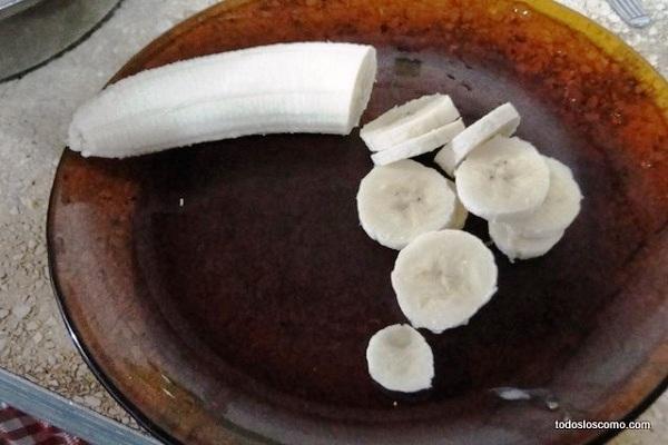 A continuación, prepara el relleno para los buñuelos dulces de la abuela. Como hemos indicado en la introducción, hemos elegido rellenarlos con plátano por lo que tendrás que cortar un plátano en rodajas finas con la ayuda de un cuchillo. También es posible elaborar los buñuelos sin relleno, pues igualmente quedan deliciosos.