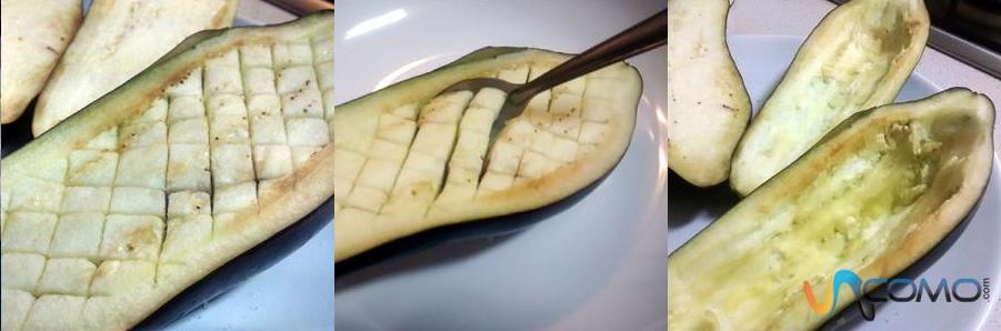 El siguiente paso será vaciar los calabacines para así poder rellenarlos después; para ello, te recomendamos que hagas cortes en forma de cuadrícula con el cuchillo sobre la pulpa del calabacín. A continuación, ayúdate de un sacabolas o una cuchara para quitar la pulpa y dejar únicamente la cáscara, que reservaremos para luego.