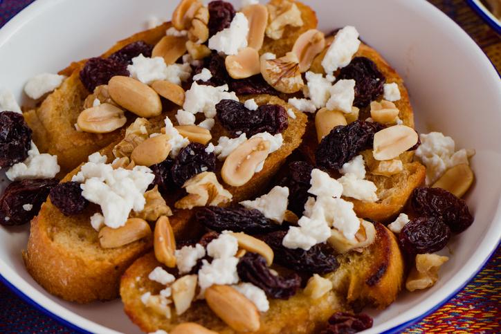 Agrega las uvas pasas, el cacahuete, las almendras y las nueces. Si lo prefieres, trocea previamente el cacahuete y las nueces. Las almendras puedes comprarlas ya fileteadas.