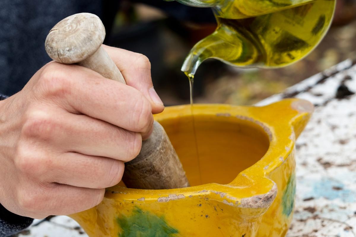 En este punto de la receta, procede a preparar la salsa alioli. Para que el mortero no se mueva, pon un paño de cocina debajo. Añade en el mortero los dientes de ajo cortados a discos y un poco de sal. Machaca con intensidad hasta que los ajos queden bien picados.