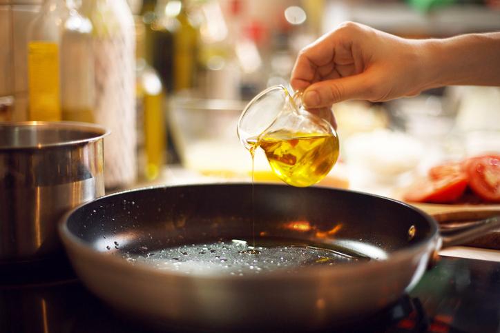 Vierte el aceite en una sartén amplia y pon el fuego bajo. Cubre el fondo de la sartén con el aceite (si usas aceite de oliva, que sea suave y para freír). Mantén durante todo el proceso el fuego bajo.