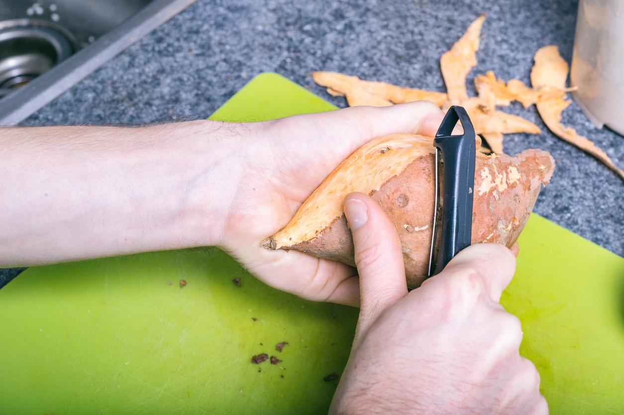 Para empezar con la receta de chips de boniato al horno primero prepara los boniatos y pélalos completamente.