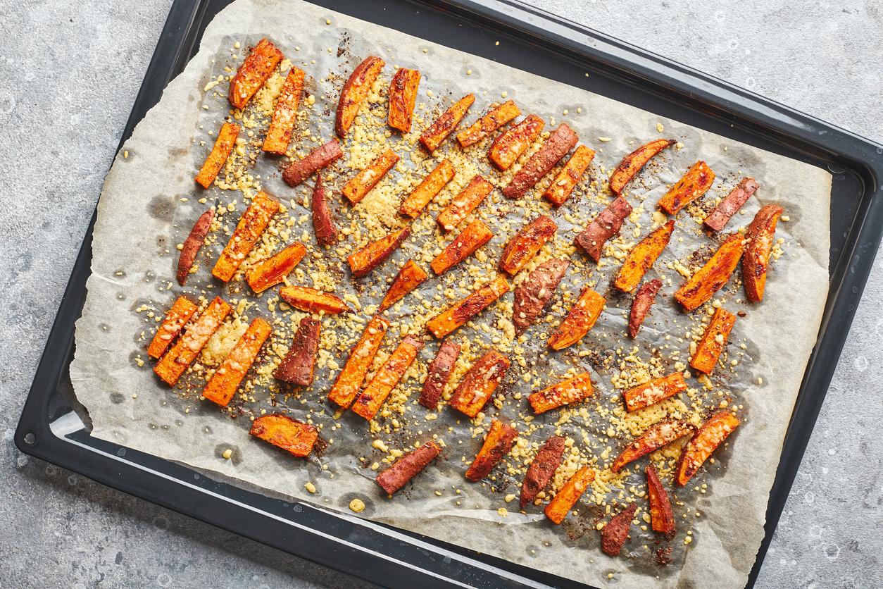 Cuando tengas las tiras o rodajas de boniato, lávalas con agua fría y deja que se sequen a temperatura ambiente. Luego extiéndelas sobre la bandeja del horno, que deberás haber cubierto anteriormente con papel especial para hornear.