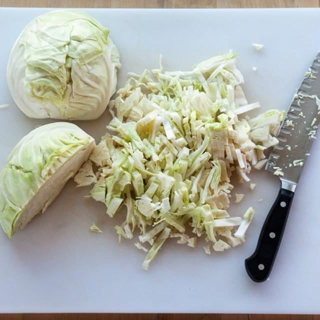 Desecha las hojas exteriores marchitas del repollo. Corta el repollo en cuartos y recorta el núcleo. Corta cada cuarto en toda su longitud, por lo que tendrás 8 trozos. Corta cada cuña transversal en tiras muy finas.