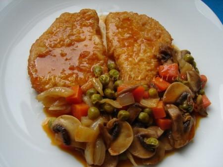 El último paso para tener nuestras chuletas a la jardinera es añadir los vegetales. Puedes comprar vegetales frescos o si lo prefieres, comprar una bolsa de verduras congeladas y verterla en el plato. Es más cómodo y también está muy rico. Nuestra recomendación es añadir estas verduras y vegetales: maíz, champiñón y guisantes. También puedes añadir unas ricas habas. Deja los vegetales cocer durante unos 10 minutos más y retira del fuego.