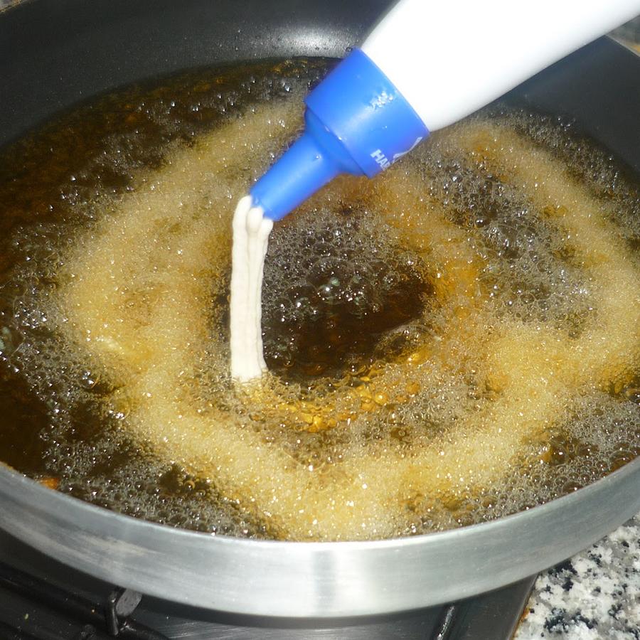 Cuando esté caliente, introduce la masa de churros sin gluten en una manga pastelera y dale forma a los churros directamente en la sartén. Si es necesario, baja el fuego. Puedes usar una boquilla con forma de estrella para darle la forma tradicional o cortar uno de los picos de una bolsa de plástico y usarla a modo de manga. Deberás freír los churros hasta que estén bien dorados. Recuerda que debes darle la vuelta.