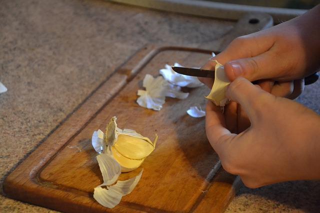 A continuación debes pelar los dientes de ajo y cortarlos en láminas que después debes distribuir por toda la bandeja. Si prefieres que el conejo tenga el sabor del ajo pero no comerte ningún trozo, basta con que peles los ajos y los pongas enteros. Una vez colocadas todas las especias y el ajo, pon una cucharada de aceite de oliva sobre el conejo troceado. Debes procurar que todo quede bien impregnado de aceite, mueve las piezas de carne para que se absorba mejor.