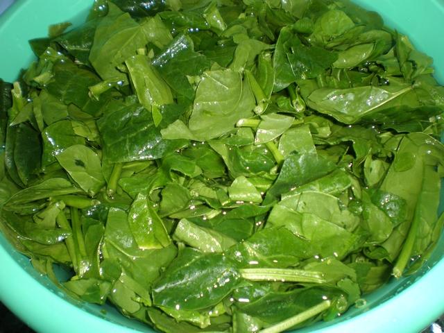 Prepara las espinacas, si las has comprado frescas primero corta los tallos gruesos con la ayuda de un cuchillo o retíralos con la mano. Luego, colócalas en un escurridor y remójalas bajo el grifo durante unos minutos para quitar cualquier resto de suciedad. Una vez estén listas, trocéalas e introdúcelas en la olla junto a la cebolla y el ajo y añade agua hasta llegar a cubrir las espinacas por completo.