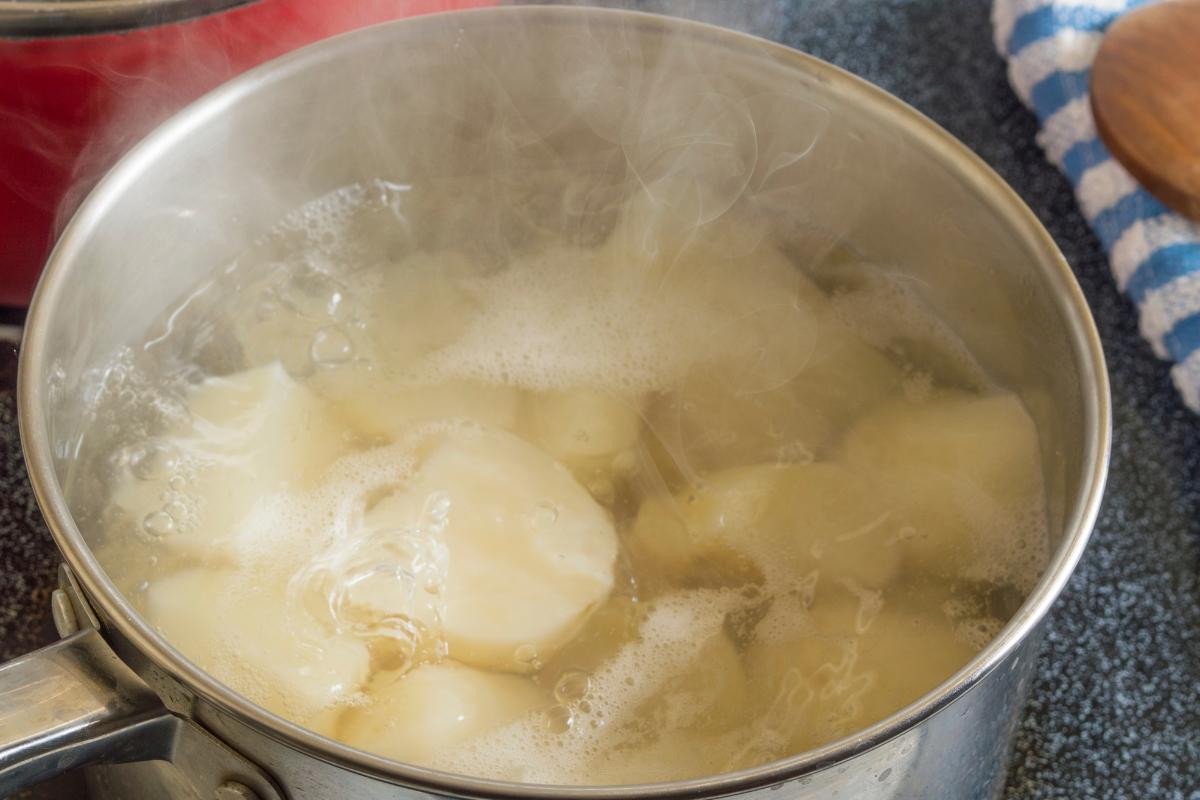 Cuando hayas agregado las patatas sofríelas otros 5 minutos. Es importante que las laves nuevamente después de haberlas pelado. Puedes cortarlas en trozos con el cuchillo, ya que este proceso, conocido como 'chascar', permite que se libere la fécula, la cual es beneficiosa y ayuda a espesar la preparación.