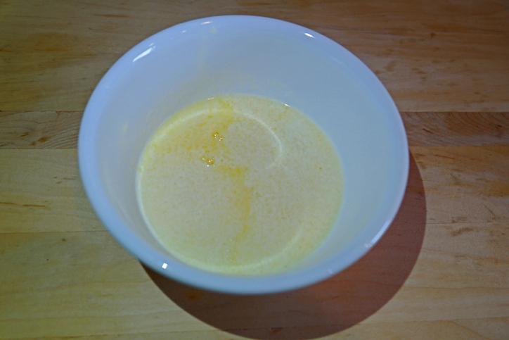 Una vez derretida, viértela en un cuenco más grande para mezclarla con el resto de ingredientes. Después de la mantequilla, añade la leche, el azúcar, la vainilla y los huevos. Bate con una batidora de varillas o con unas varillas manuales.