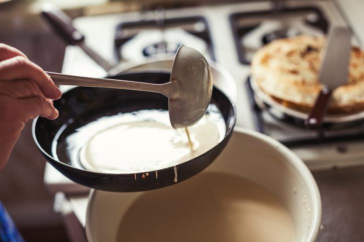 Recuerda que, a partir de la primera crepe, la sartén estará más caliente y la masa se cocinará antes, por lo que puedes bajar el fuego si lo crees necesario. Si no cuentas con una sartén antiadherente, te recomendamos engrasar la sartén antes de hacer cada nueva crepe.