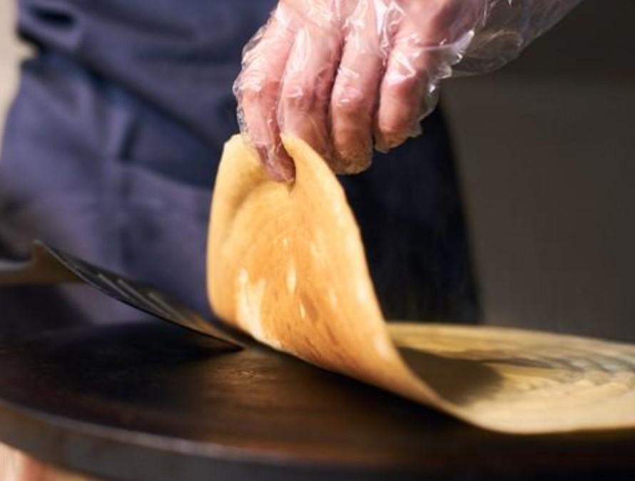 Para darle la vuelta, solo tienes que despegar un poco el borde de la crepe, puedes ayudarte levantándolo con una espátula. Nuestro consejo es que una vez la despegues con la espátula, la cojas con los dedos y le des la vuelta girándola con tus dedos. Si metes una espátula o cucharón por debajo e intentas darle la vuelta, es probable que el utensilio que utilices levante la crepe desde el centro y los bordes se rompan o se arrugue al girarse.