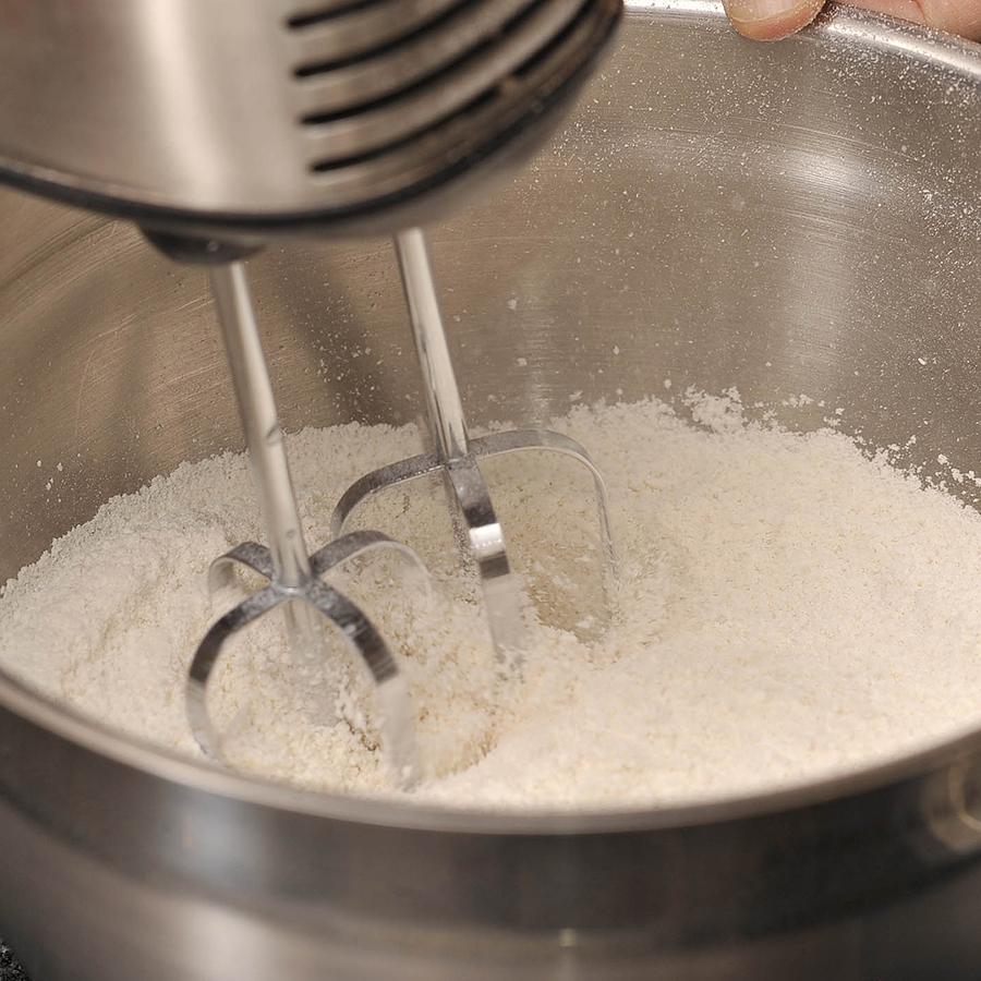 En este segundo recipiente deberás mezclar la harina, previamente tamizada, con el azúcar. Luego, añade la mantequilla y bátelo todo. Es aconsejable que la mantequilla esté a temperatura ambiente para que te sea más fácil mezclarla con la harina. Si lo deseas, puedes añadir una pizca de sal.