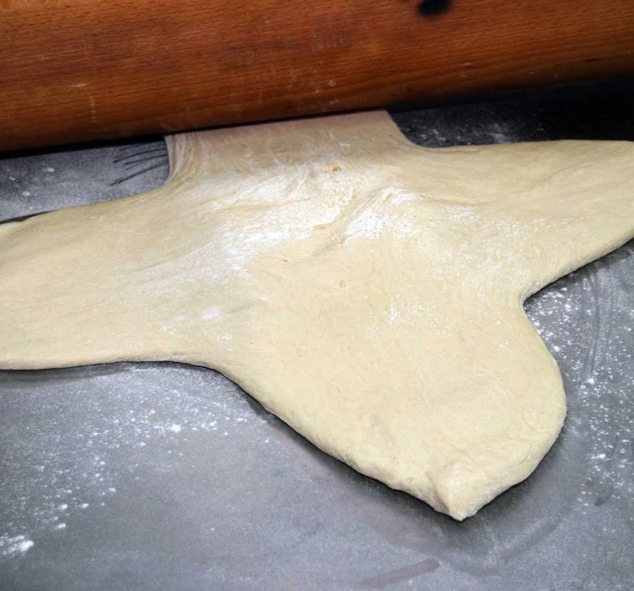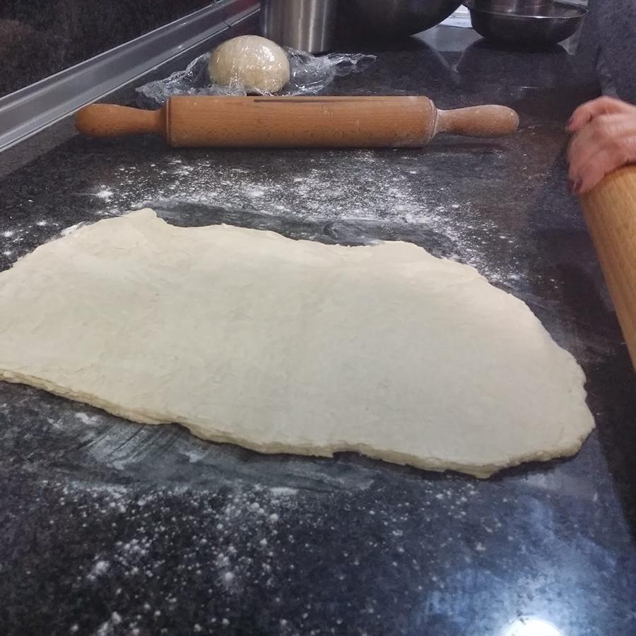 Cuando tengas la masa lista, haz una bola, introdúcela en el bol que usaste antes, cúbrela con un paño limpio y déjala reposar durante 2 horas. Pasado el tiempo, vuelve a amasarla, haz una bola y realiza un corte en cruz sobre ella. Ahora, con un rodillo, estira la masa siguiendo la cruz. Esto lo hacemos porque deberemos doblar varias veces la masa, como hacemos con la de hojaldre.