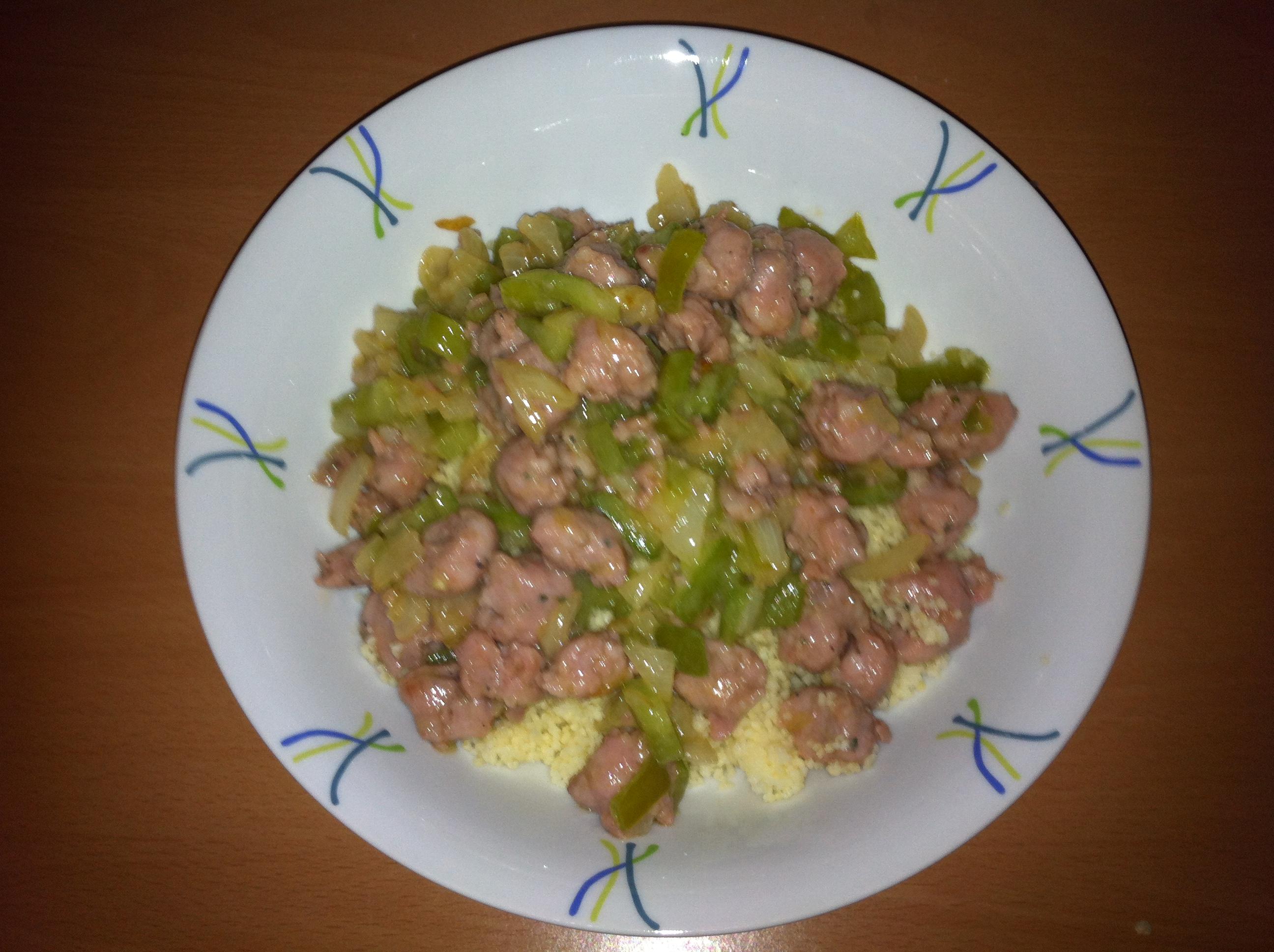 El cuscús es un plato tradicional de Marruecos y Argelia hecho a base de sémola de trigo. El nombre árabe cuscús significa "la comida" ya que es el plato principal en muchos de los pueblos del norte de África. En los últimos años, nuestra cocina se ha ido influenciando de la árabe y hoy en día el cuscús está ya muy introducido en nuestra cultura culinaria. A continuación, os explicamos paso a paso cómo hacer cuscús con salchichas para dos personas.