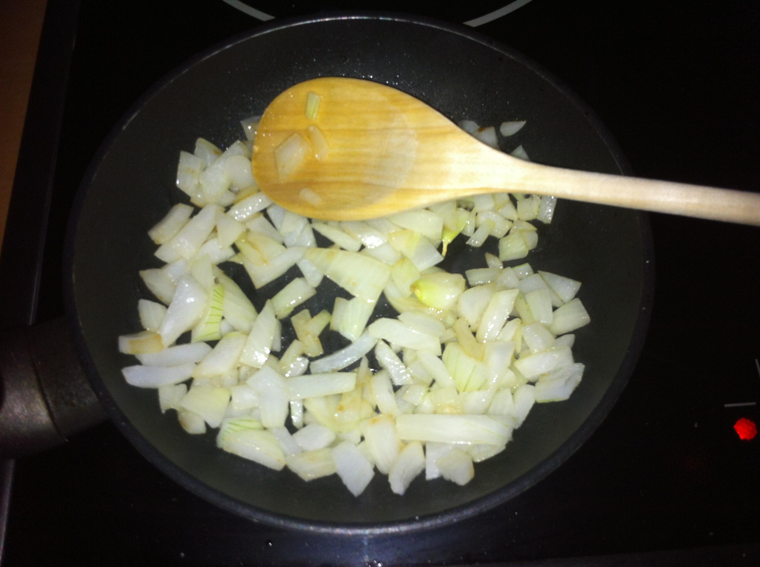 Pon una cebolla troceada en un poco de aceite bien caliente en una sartén. Remueve contínuamente para que no se queme.