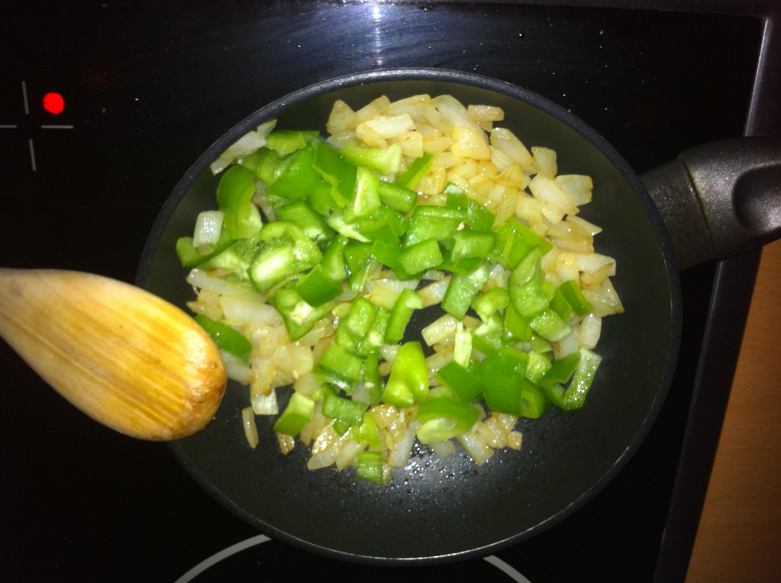 Cuando la cebolla esté doradita, añade un pimiento verde troceado. Ves removiéndolo para que no se queme.