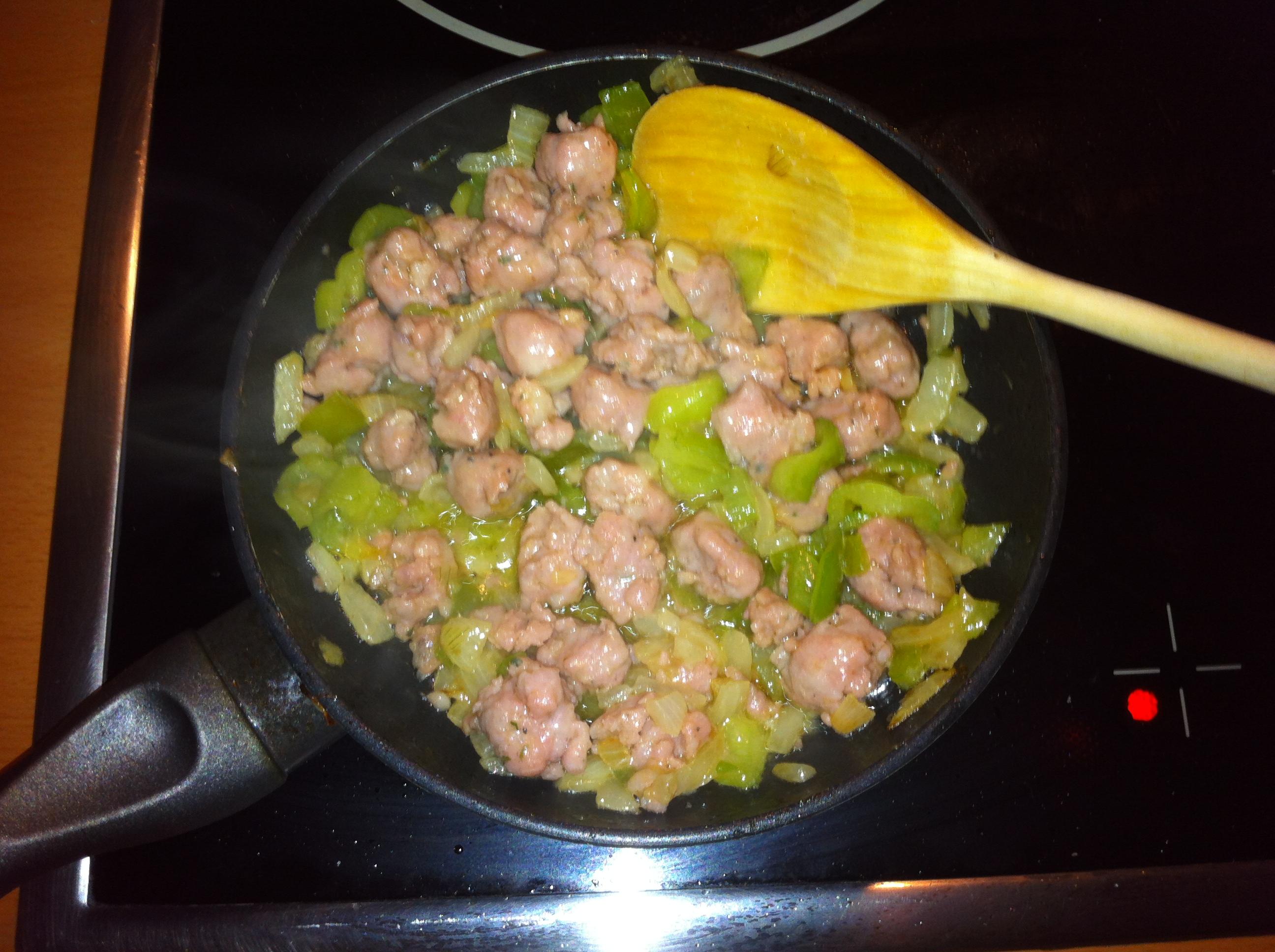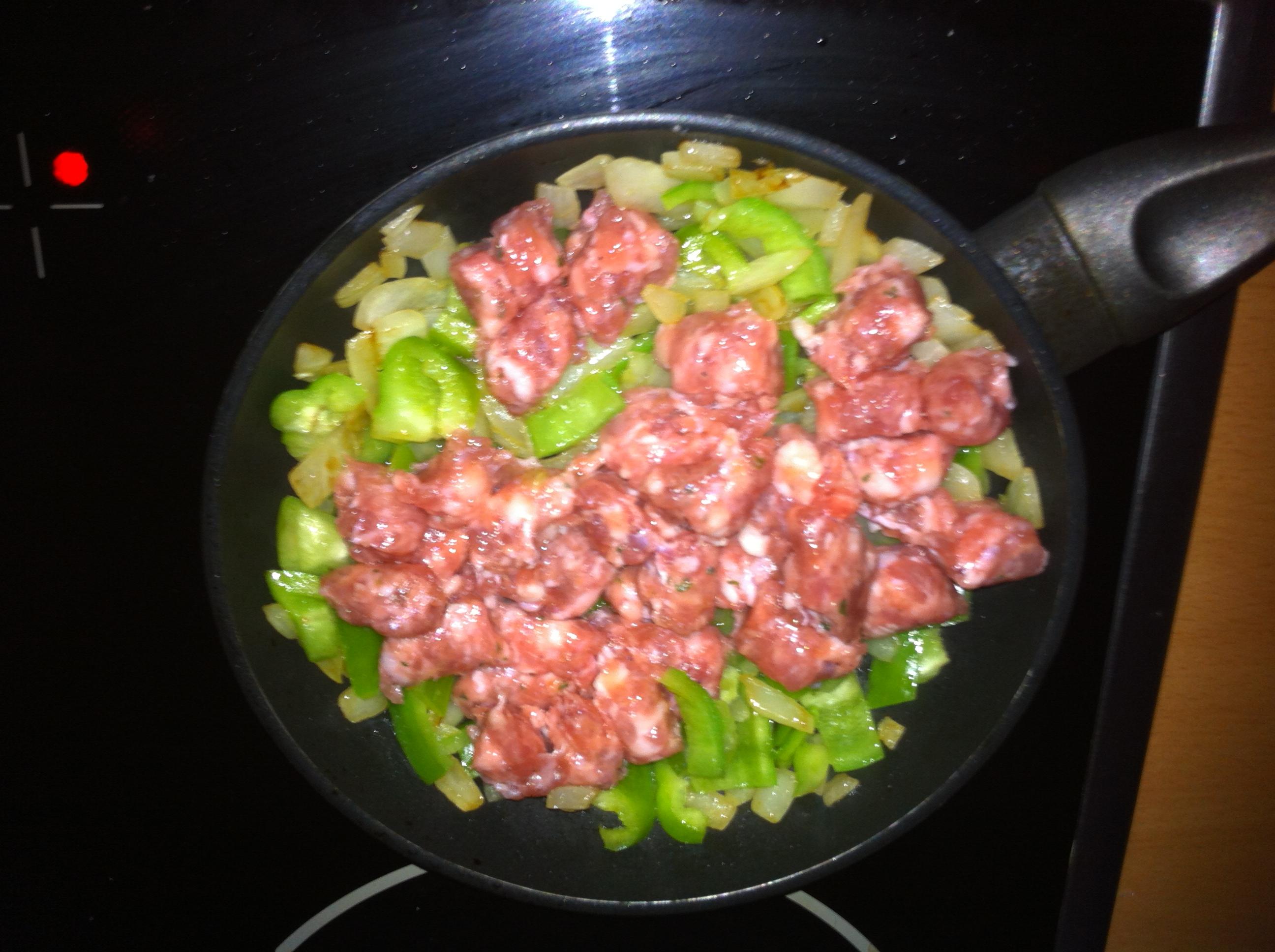 Cuando la cebolla y el pimiento estén hechos, añade cuatro salchichas troceadas a la sartén. Ves removiendo hasta que estén hechas.