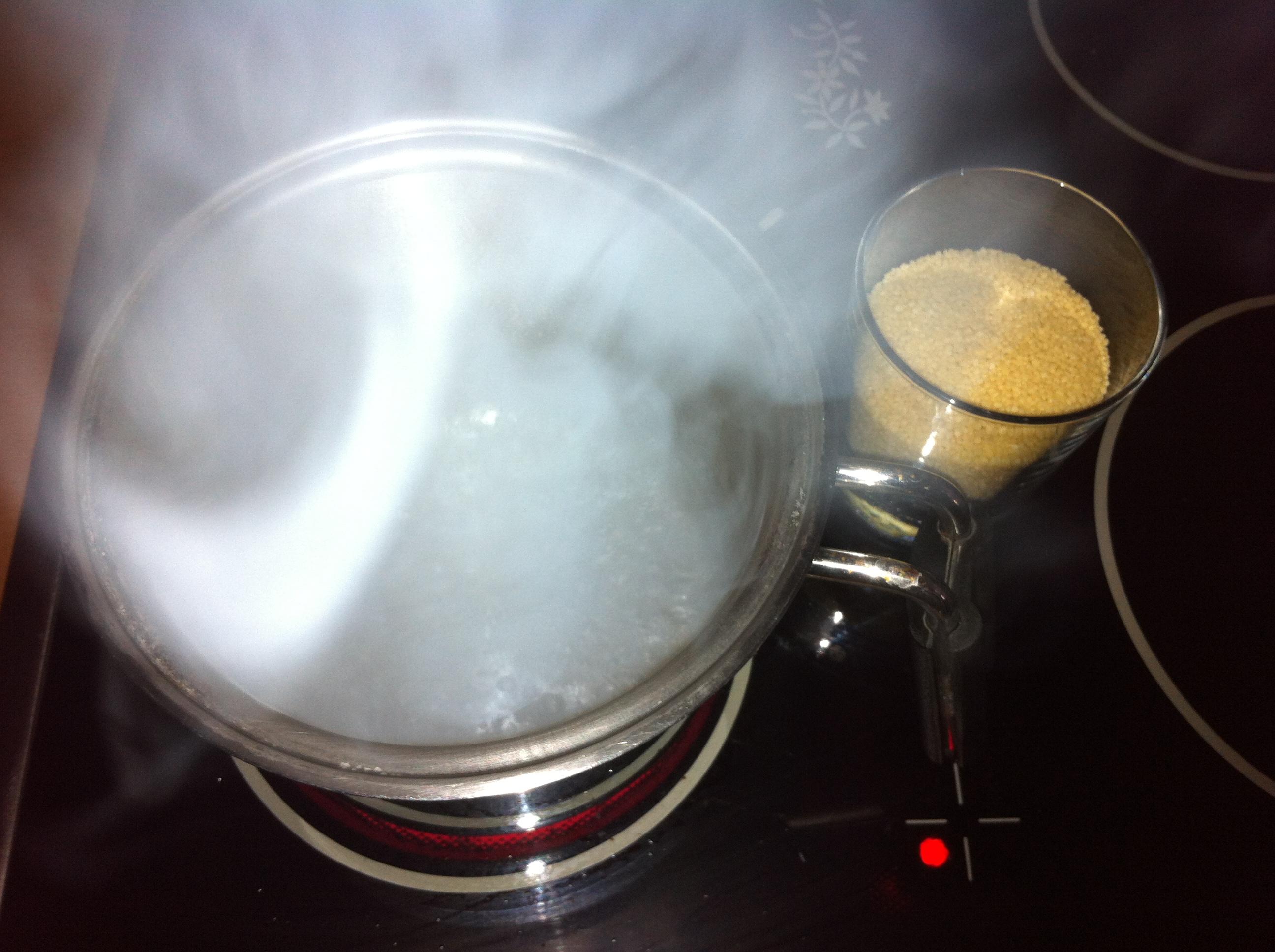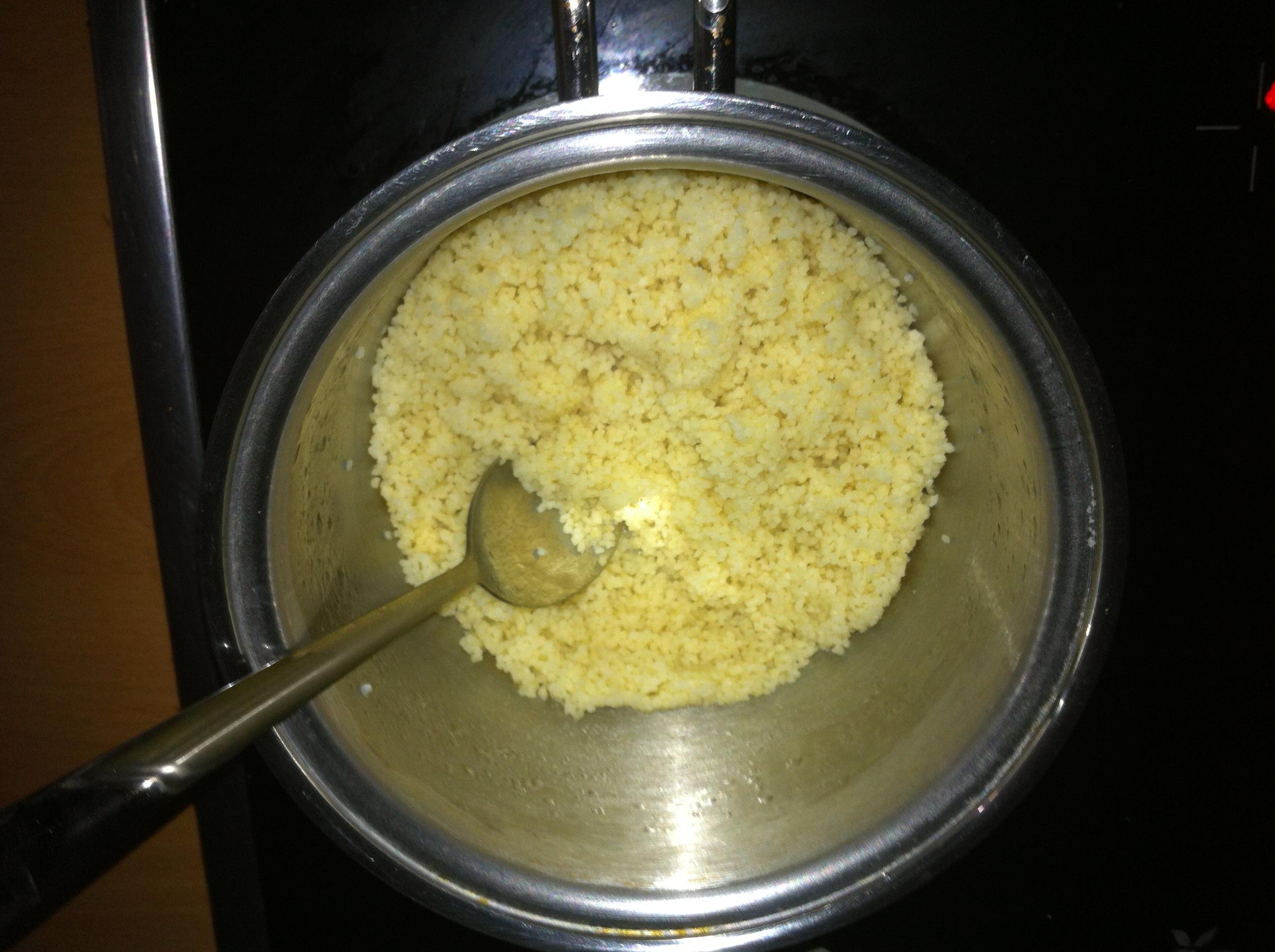 Cuando el agua rompa a hervir, añade la misma cantidad de cuscús que de agua (en este caso un vaso). Pon un chorrito de aceite en el cazo y remueve durante unos segundos. Después de ésto, retira el cazo del fuego y tápalo para dejarlo reposar durante unos minutos.