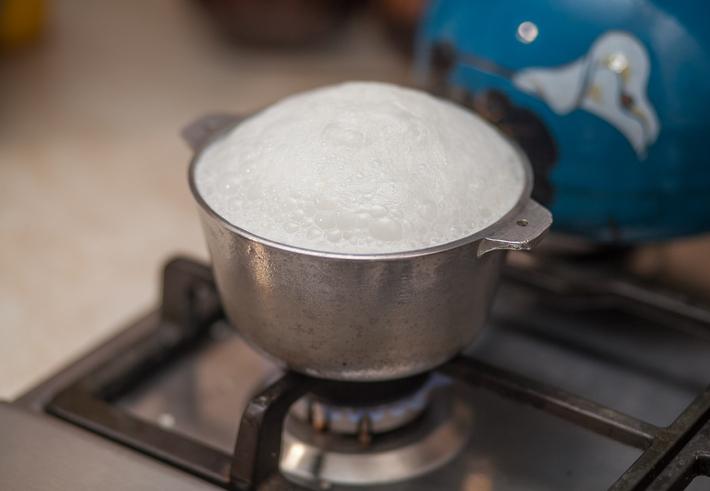 Si ves que la leche se sube, solo retira la olla del fuego un momento y colócala de nuevo cuando se asiente. No te preocupes, esto solo ocurrirá al principio de la cocción.