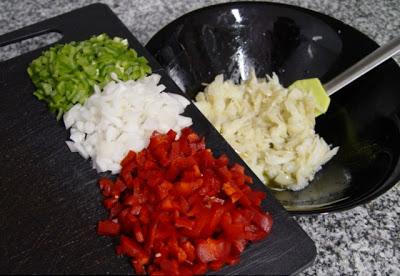 Seguidamente, tendrás que pelar y picar la cebolla y lavar y cortar a dados los tomates, el pimiento rojo y verde para agregarlo al bacalao "esqueixado" o desmigado.