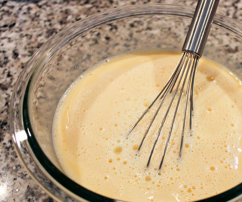 En un bol, bate los huevos y a continuación añade el azúcar y la leche y mézclalo bien con la ayuda de unas varillas, ya sean manuales o eléctricas