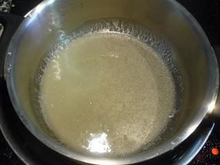 Haremos casi toda la preparación al baño maría, y a fuego lento si es la primera vez que lo hacemos, por lo que necesitarás un recipiente con la capacidad sufieciente. Cuando la glucosa se haya disuelto agrega la glicerina, recuerda que no debes dejar de mover. Cuando se haya integrado añade la mantequila. Verás que los ingredientes no tardan nada en disolverse, por lo que este es un proceso rápido.