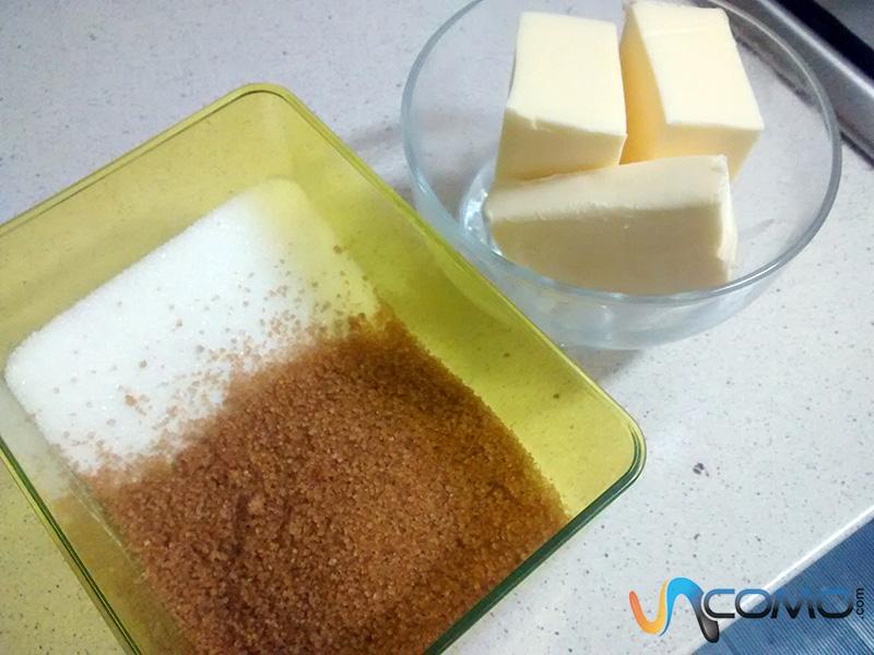 Lo primero que deberás hacer para elaborar tus cookies caseras será pesar el azúcar -50 gramos de moreno y 50 blanco- y derretir la mantequilla, por ejemplo en el microondas.