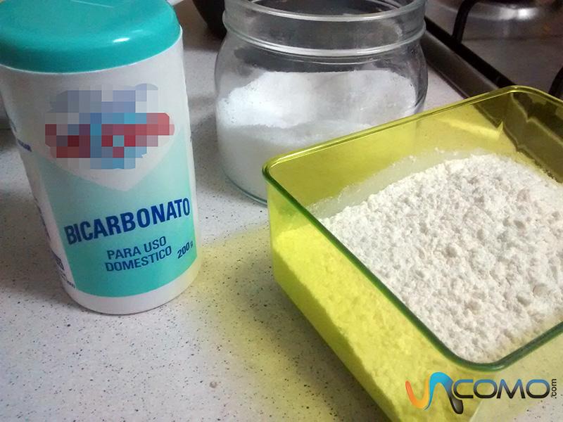 Por otro lado, deberás juntar los ingredientes secos: 150 gramos de harina para bizcochos tamizada -si no dispones de ella, también puedes usar harina de todo uso- con media cucharadita de bicarbonato sódico y una pizca de sal.