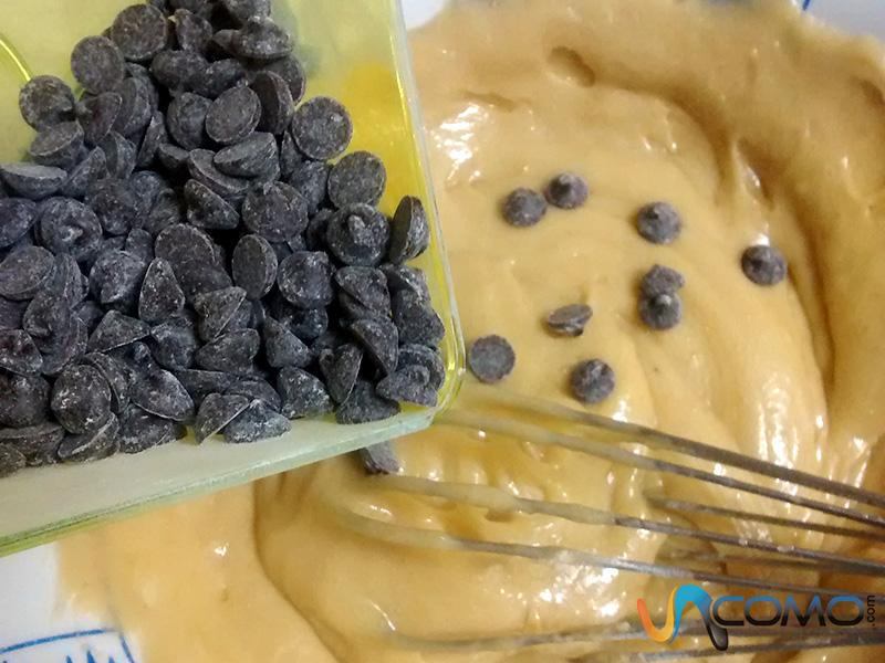 Ahora llega el turno de añadir las pepitas de chocolate, pero te recomendamos que primero las pases por un poco de harina -como si las rebozaras- para evitar que estas queden en el fondo del bol.