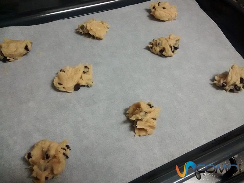 Precalienta el horno a 180º y coloca papel vegetal o para hornear en la bandeja y, a continuación, ayúdate de dos cucharas de postre para verter la masa de las galletas con pepitas de chocolate. No será necesario que tengan forma redonda, ya que se aplastarán por sí solas, y será muy importante que dejes una buena separación entre ellas, para que no se junten. Lo más probable será que tengas que hacer dos tandas de horneado para la masa preparada.