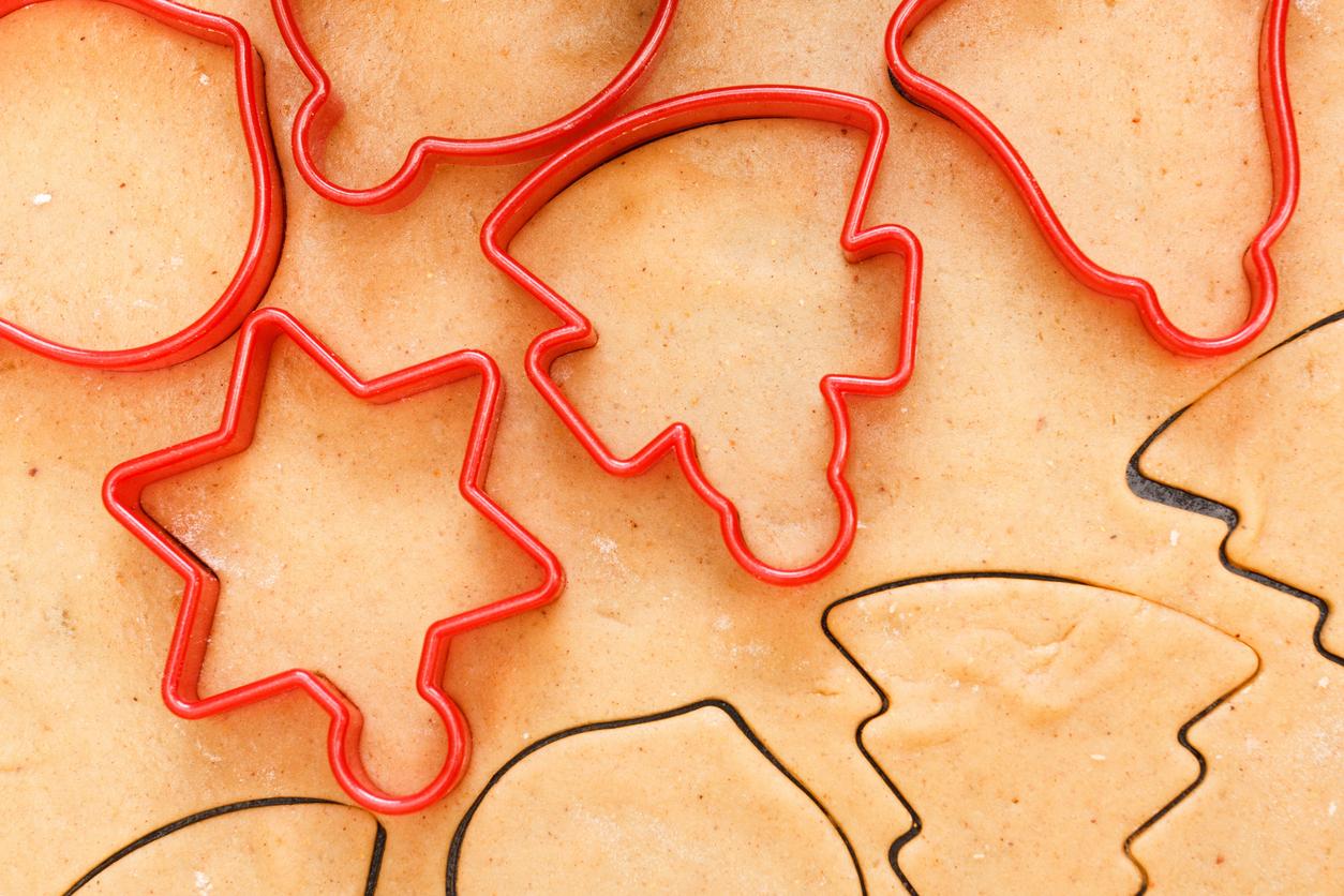 Usa un cortador de pasta para modelar las galletas de jengibre fáciles. Ten a mano uno o varios cortadores de galletas con motivos navideños. Una vez pasado el tiempo de refrigeración, pon la masa sobre la superficie de trabajo y retira solo el papel de arriba.