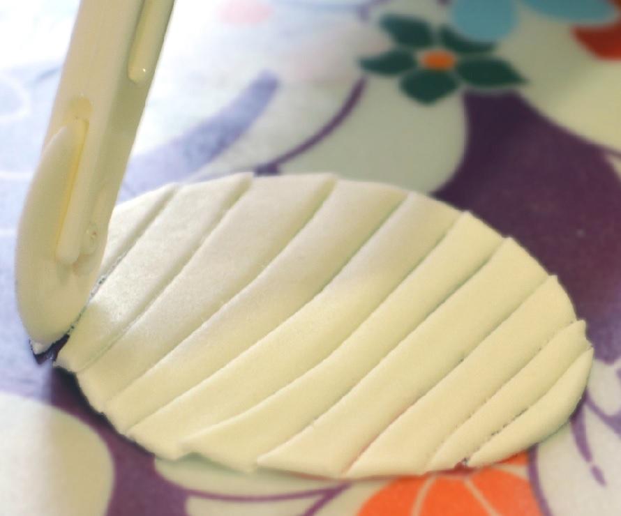 Ahora viene la parte más divertida, dar forma a la momia. Para dar a las galletas para Halloween la forma de momia deberás repetir el paso 1 y cortar a tiras la base redonda. Estas tiras simularán la venda de la momia y harán las galletas de momia más reales.