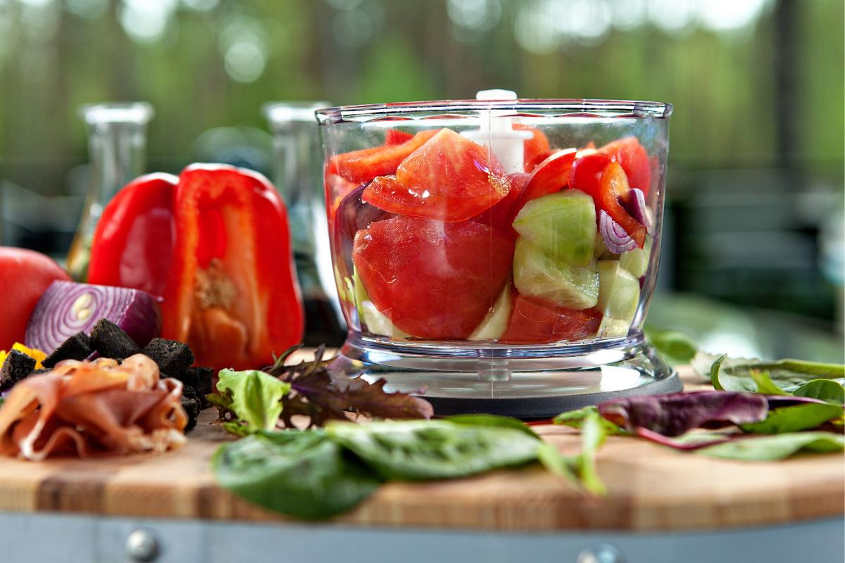 Agrega el aceite de oliva, un poquito de vinagre y sal y vuelve a triturar los ingredientes. Prueba un poco para comprobar si ha quedado bien de sabor y textura.