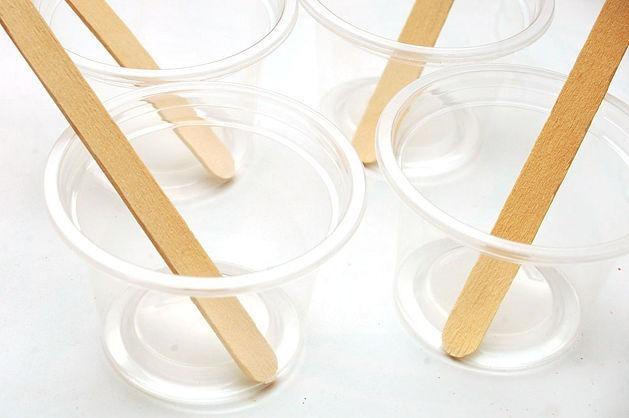 Rocía el interior de las tazas de plástico con aceite en aerosol para que la gelatina se deslice con facilidad más adelante. Agregar pequeñas cucharas de plástico o palitos de paleta puede ayudar también.