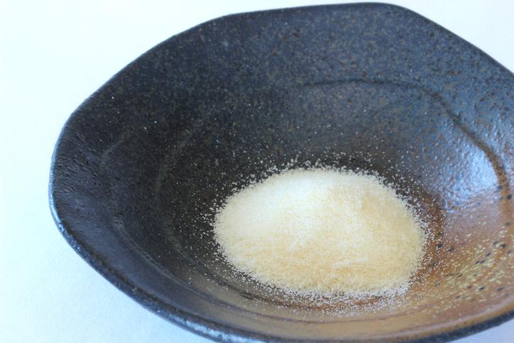 Vierte la taza de agua fría en un bol y, lentamente, espolvorea en ella la gelatina en polvo para que se hidrate durante 5 - 8 minutos.