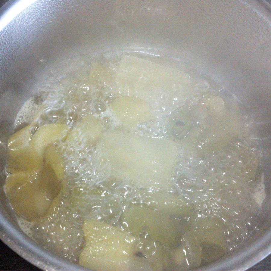 Coge un cazo u olla, añade las pieles y corazones de manzana, cúbrelas con agua y cuécelas a fuego medio hasta que hierva. Cuando alcance el punto de ebullición, baja a fuego lento y dejalo hasta que las partes de las manzanas se ablanden. Cuando estén blandas, apaga el fuego.