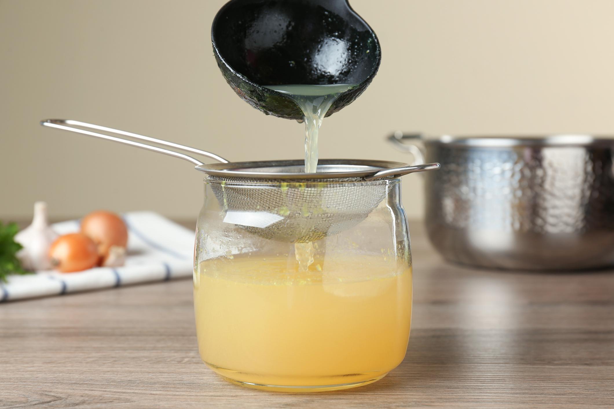 Una vez hecho, con un cucharón coge el caldo y cuélalo. Lo ideal es hacerlo con un colador en el que hayas puesto un paño fino para tamizarlo perfectamente y que no se filtre ningún pequeño ingrediente (¡ojo con las espinas!).