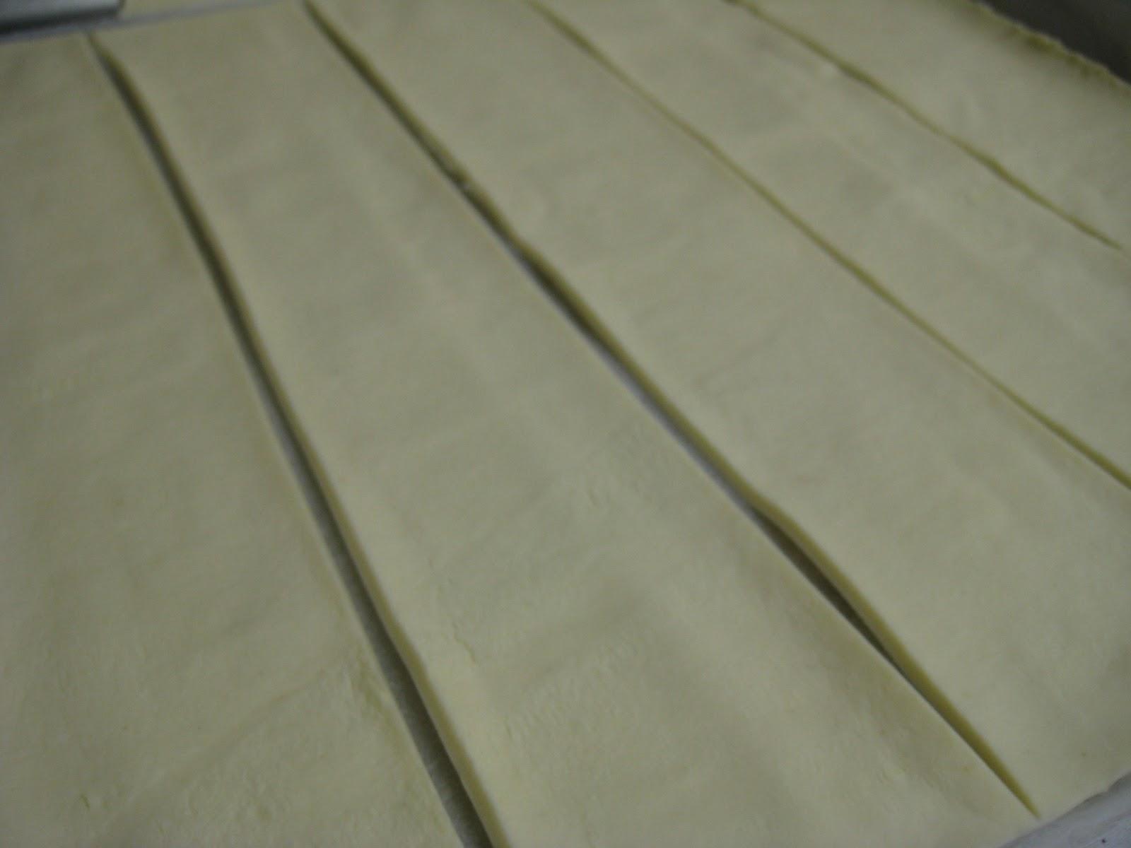 Estender la masa de hojaldre y cortar tiras de unos 4 centímetros de ancho con un cuchillo.
