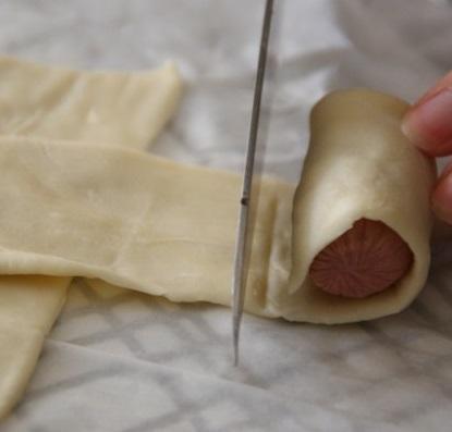 Enrollar el relleno con la masa de hojaldre y cuando esté todo cubierto cortar la masa y sellar apretando con los dedos (no cerrar el hojaldrito por los extremos).