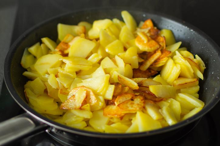 Durante este tiempo, fríe las patatas: pélalas, córtalas a tacos pequeños y fríelas. Para freír las patatas, usa aceite de girasol en abundancia. Observa el tono que van tomando hasta que estén doradas, pero no muy crujientes. Una vez veas que ya están listas, ponlas sobre papel de cocina para quitarles el exceso de aceite. Échales un poco de sal por encima.