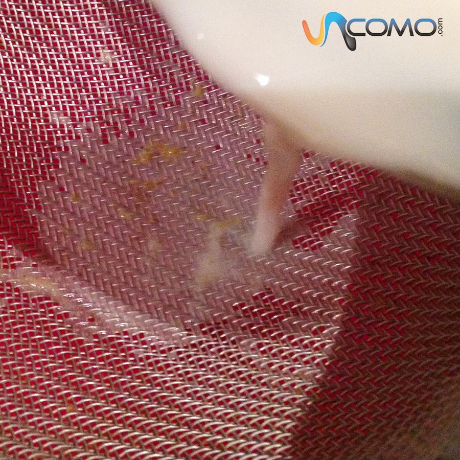 Cuando la leche merengada esté bien fría, retírala del frigorífico y cuélala para eliminar los restos de ralladura y canela. Puedes hacerlo directamente sobre el recipiente que utilizarás para servirla. Luego, incorpora las claras batidas y mézclalo todo. Si prefieres obtener una textura más líquida, utiliza una clara en lugar de dos.