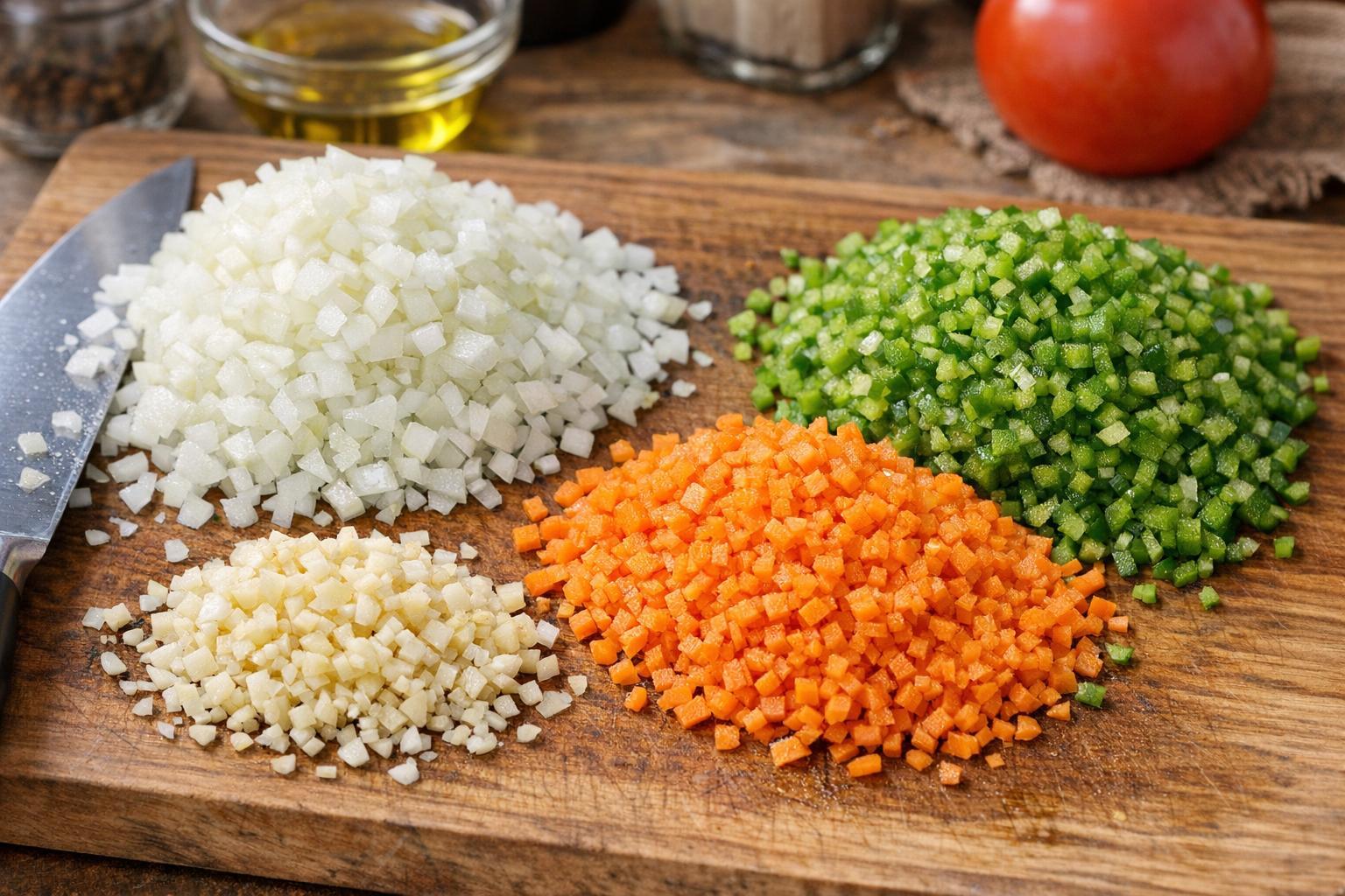 A continuación, pela la cebolla, los ajos, la zanahoria y el pimiento verde. Pícalos muy finitos, ya que el sofrito será la base del sabor del guiso. Cuanto más pequeño esté el corte, mejor se integrarán los ingredientes y más sabroso resultará el caldo.