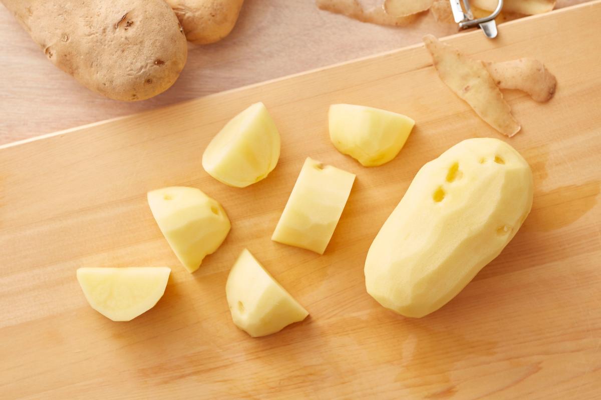 Pela las patatas y córtalas en dados medianos, procurando chascarlas ligeramente al final del corte. Esto se hace clavando el cuchillo y rompiendo el último trozo en lugar de cortarlo limpio, lo que ayuda a que la patata suelte almidón durante la cocción y espese el guiso de forma natural.