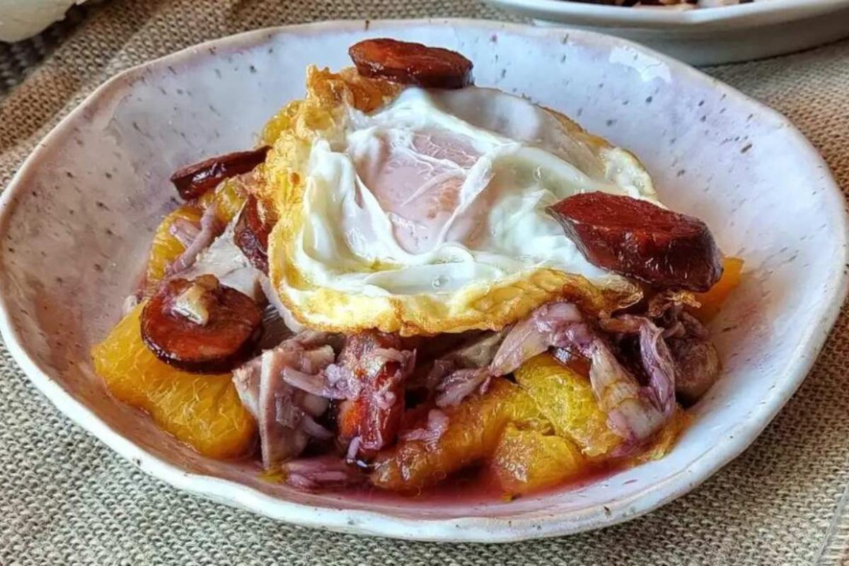 Toca la hora de comenzar a emplatar. Para ello, coloca en la base de la fuente las rodajas de cítricos dispuestas como una cama o almohada redonda. Añade los huevos fritos o cocidos, ya sea en rodajas o picados esparcidos por todo el pato de forma irregular. Por último, agrega el picadillo o chorizo para darle todo el sabor ahumado y aceitoso.