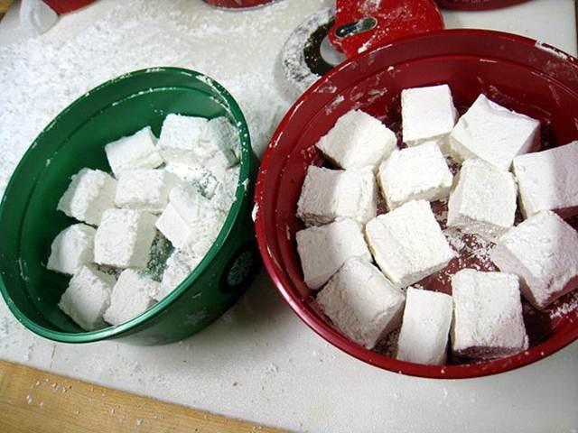 Esta es la receta para hacer malvaviscos. Es importante tener en cuenta que los malvaviscos son realmente pegajosos. Para solucionar este problema utiliza constantemente maicena, y es una buena idea humedecer los utensilios de cocina e incluso tus manos con aceite.