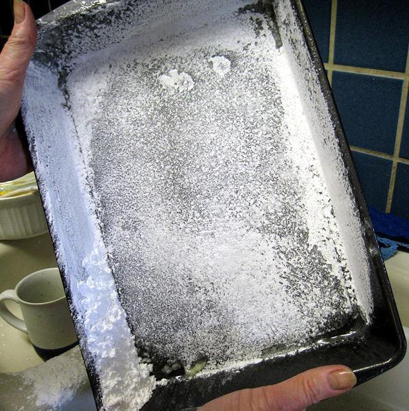 Esto es para la bandeja del horno. Los malvaviscos son muy pegajosos. Espolvorea la mezcla en una bandeja bien engrasada, o aceitada. También puedes usar papel para hornear, pero la mezcla anterior es recomendable.